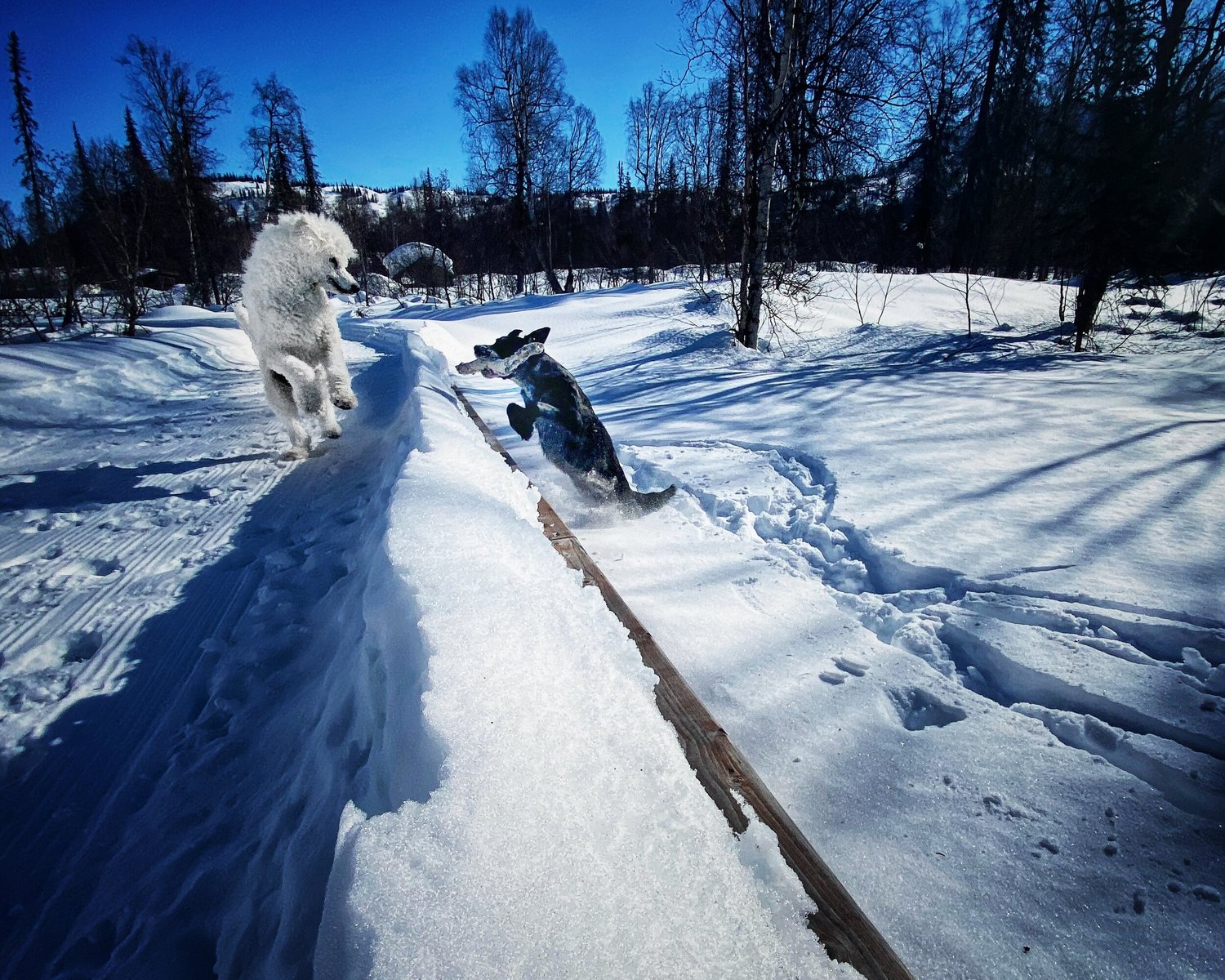 White standard poodle and a catahoula leopard dog enjoying the spring snow in Denali State Park, Alaska