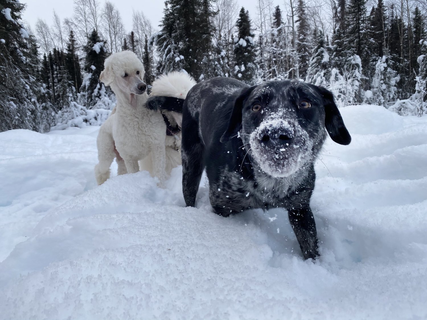 Kluane, a standard poodle, enjoys playtime in the snow in Alaska. Kluane keeps her paws protected with an Alaska made salve called Pampered Paws